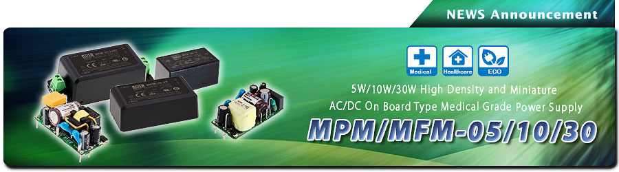 Để nâng cao năng lực cạnh tranh trong ngành công nghiệp thiết bị y tế và đáp ứng xu hướng ngày càng phát triển đòi hỏi các thiết bị phải nhỏ gọn.Meanwell đã thiết kế lại bo mạch với mật độ cao và thu nhỏ trên bo mạch nguồn AC/DC, loại nhỏ gọn MPN-05/10/30 và loại PCB MFN-05/10/30.So với thế hệ trước PM và NFM, dòng MPM và MFN mới có kích thước chỉ có 1/3 PM và NFM, nhưng nhiệt độ hoạt động rộng hơn,hiệu suất cao và công suất tiêu thụ không tải thấp.Thiết kế 2 bộ sản phẩm này tuần thủ tiêu chuẩn IEC/EN60601-1 và ANSI/AAMI ES60601-1 về quy định an toàn liên quan đến thiết bị y tế, có mức cách ly 2x MOPP và dòng rò thấp ( <80µA).Hai dòng sản phẩm này có thể được áp dụng cho loại thiết bị y tế loại BF.Ứng dụng thiết bị phù hợp bao gồm thiết bị kiểm tra y tế, thiết bị y tế xách tay và thiết bị y tế đòi hỏi điện năng tiêu thụ cực thấp,…